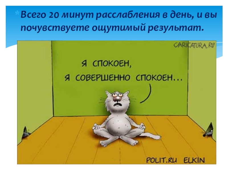Слайд 5Всего 20 минут расслабления в день, и вы почувствуете ощутимый результат.