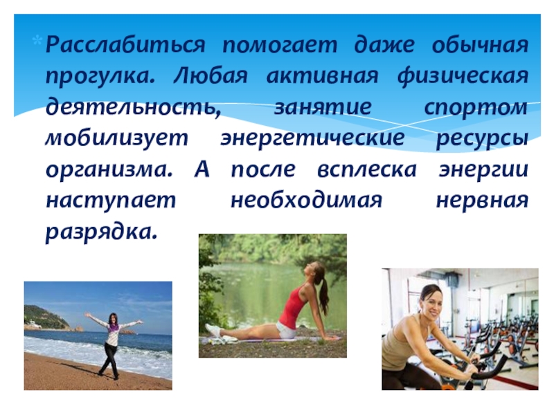 Слайд 8Расслабиться помогает даже обычная прогулка. Любая активная физическая деятельность, занятие спортом
