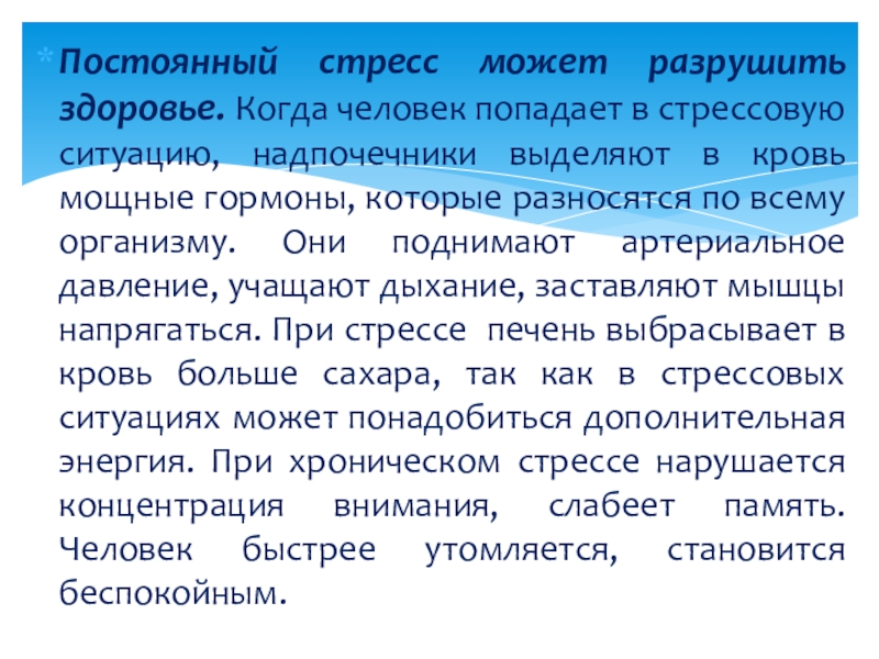 Слайд 3Постоянный стресс может разрушить здоровье. Когда человек попадает в стрессовую ситуацию,
