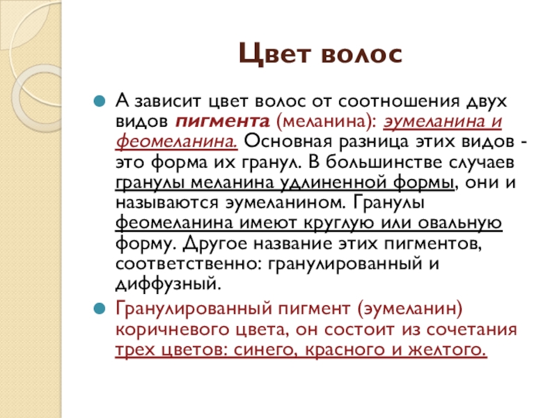 Слайд 17Диффузный (феомеланин) — желтый. Все натуральные волосы содержат оба вида пигментов.