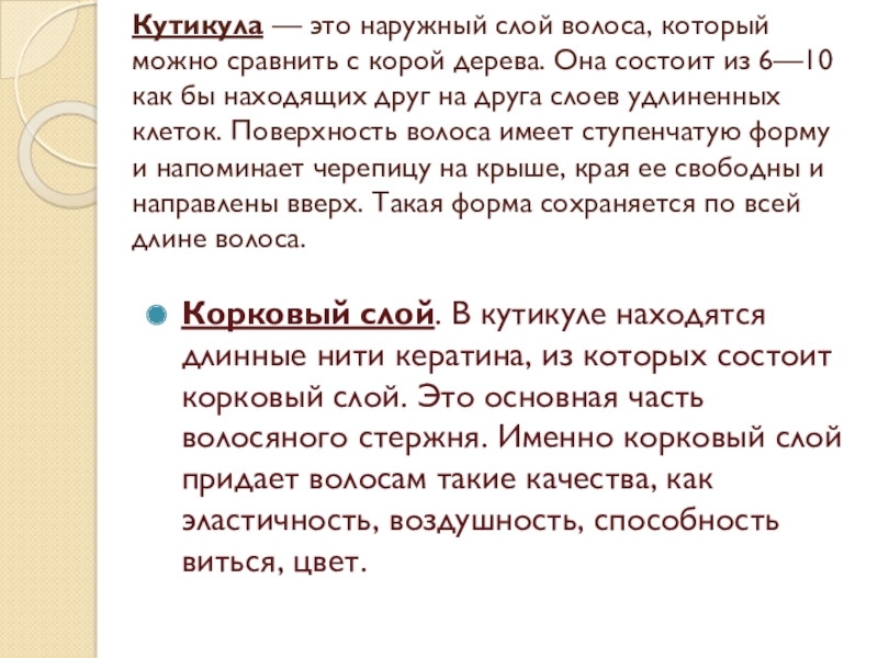Слайд 8Кутикула — это наружный слой волоса, который можно сравнить с корой
