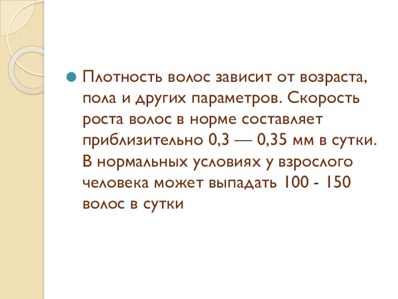 Слайд 15Плотность волос зависит от возраста, пола и других параметров. Скорость роста