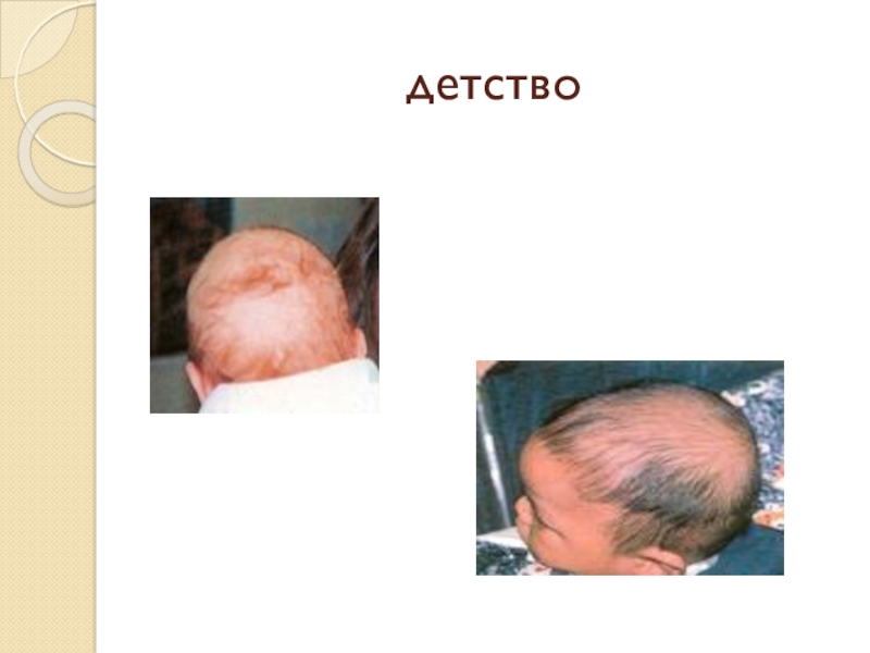 (длинные) волосы имеются только на скальпе, бровях и ресницах. Пушковые волосы растут по всему телу. После рождения имеют место две волны роста волос на голове. На затылочной части головы есть область, в которой в возрасте 8 - 12 недель могут выпасть все волосы, что зачастую неверно объясняют стиранием волос, в то время как это является нормальным физиологическим процессом в отличие от трения или давления, которые могут вызвать ломку волос.