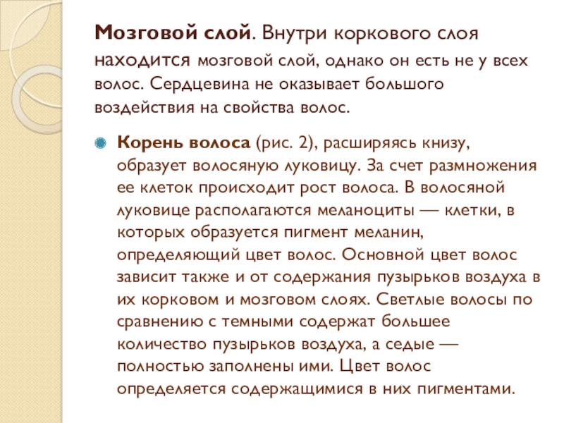 Корень волоса (рис. 2), расширяясь книзу, образует волосяную луковицу. За счет размножения ее клеток происходит рост волоса. В волосяной луковице располагаются меланоциты — клетки, в которых образуется пигмент меланин, определяющий цвет волос. Основной цвет волос зависит также и от содержания пузырьков воздуха в их корковом и мозговом слоях. Светлые волосы по сравнению с темными содержат большее количество пузырьков воздуха, а седые — полностью заполнены ими. Цвет волос определяется содержащимися в них пигментами.