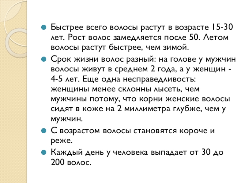 Слайд 22Быстрее всего волосы растут в возрасте 15-30 лет. Рост волос замедляется