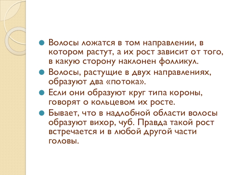 Слайд 20Волосы ложатся в том направлении, в котором растут, а их рост