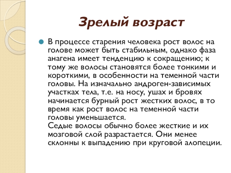 стабильным, однако фаза анагена имеет тенденцию к сокращению; к тому же волосы становятся более тонкими и короткими, в особенности на теменной части головы. На изначально андроген-зависимых участках тела, т.е. на носу, ушах и бровях начинается бурный рост жестких волос, в то время как рост волос на теменной части головы уменьшается.