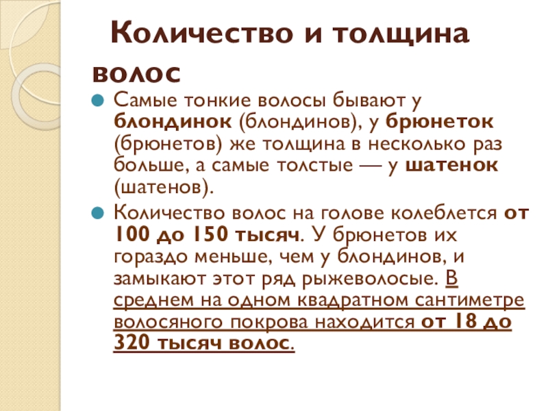 (блондинов), у брюнеток (брюнетов) же толщина в несколько раз больше, а самые толстые — у шатенок (шатенов).