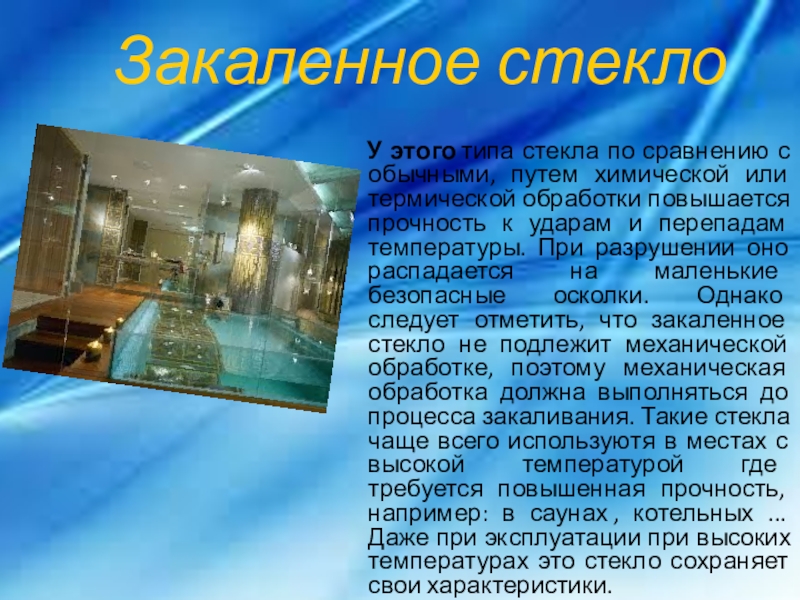 или термической обработки повышается прочность к ударам и перепадам температуры. При разрушении оно распадается на маленькие безопасные осколки. Однако следует отметить, что закаленное стекло не подлежит механической обработке, поэтому механическая обработка должна выполняться до процесса закаливания. Такие стекла чаще всего используютя в местах с высокой температурой где требуется повышенная прочность, например: в саунах , котельных ... Даже при эксплуатации при высоких температурах это стекло сохраняет свои характеристики.