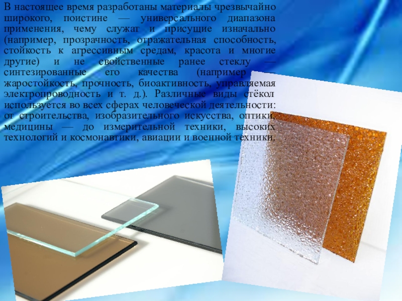 применения, чему служат и присущие изначально (например, прозрачность, отражательная способность, стойкость к агрессивным средам, красота и многие другие) и не свойственные ранее стеклу — синтезированные его качества (например — жаростойкость, прочность, биоактивность, управляемая электропроводность и т. д.). Различные виды стёкол используется во всех сферах человеческой деятельности: от строительства, изобразительного искусства, оптики, медицины — до измерительной техники, высоких технологий и космонавтики, авиации и военной техники.
