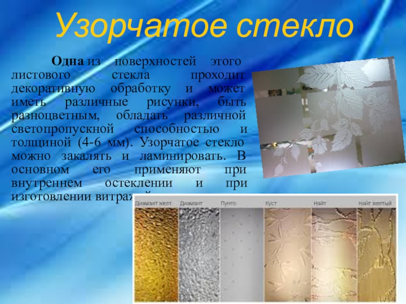 и может иметь различные рисунки, быть разноцветным, обладать различной светопропускной способностью и толщиной (4-6 мм). Узорчатое стекло можно закалять и ламинировать. В основном его применяют при внутреннем остеклении и при изготовлении витражей.