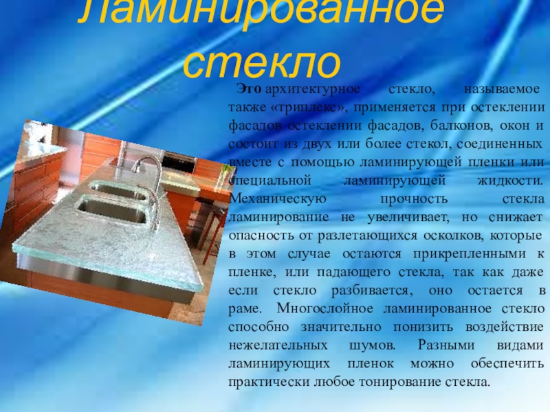 балконов, окон и состоит из двух или более стекол, соединенных вместе с помощью ламинирующей пленки или специальной ламинирующей жидкости. Механическую прочность стекла ламинирование не увеличивает, но снижает опасность от разлетающихся осколков, которые в этом случае остаются прикрепленными к пленке, или падающего стекла, так как даже если стекло разбивается, оно остается в раме. Многослойное ламинированное стекло способно значительно понизить воздействие нежелательных шумов. Разными видами ламинирующих пленок можно обеспечить практически любое тонирование стекла.