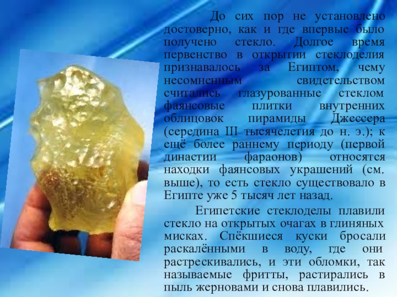 и где впервые было получено стекло. Долгое время первенство в открытии стеклоделия признавалось за Египтом, чему несомненным свидетельством считались глазурованные стеклом фаянсовые плитки внутренних облицовок пирамиды Джессера (середина III тысячелетия до н. э.); к ещё более раннему периоду (первой династии фараонов) относятся находки фаянсовых украшений (см. выше), то есть стекло существовало в Египте уже 5 тысяч лет назад.