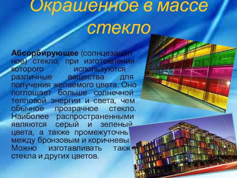 различные вещества для получения желаемого цвета. Оно поглощает больше солнечной тепловой энергии и света, чем обычное прозрачное стекло. Наиболее распространенными являются серый и зеленый цвета, а также промежуточные между бронзовым и коричневым. Можно изготавливать также стекла и других цветов.