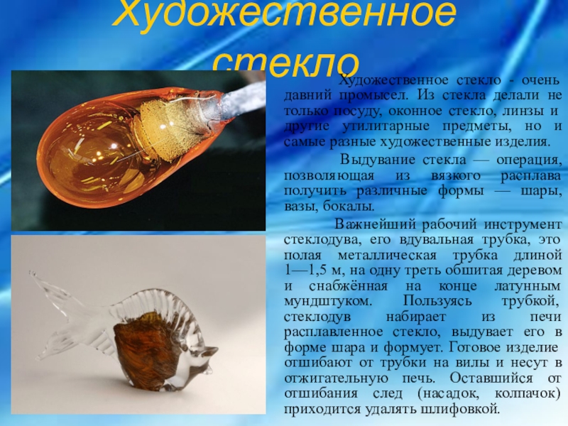 Выдувание стекла — операция, позволяющая из вязкого расплава получить различные формы — шары, вазы, бокалы.