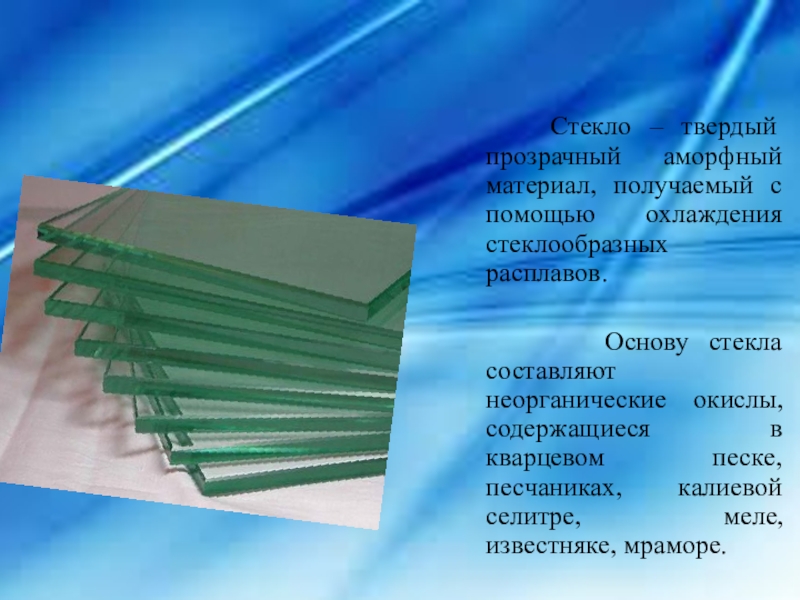 Слайд 2 Стекло – твердый прозрачный аморфный материал, получаемый с помощью