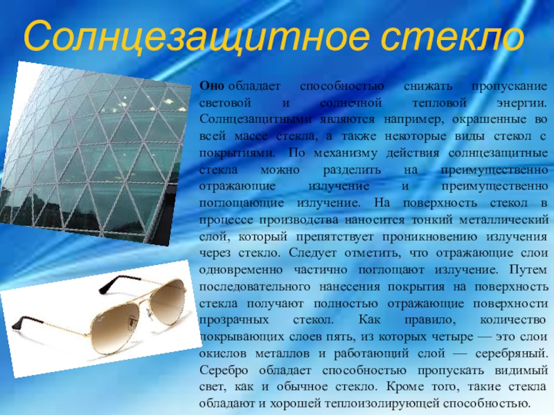 являются например, окрашенные во всей массе стекла, а также некоторые виды стекол с покрытиями. По механизму действия солнцезащитные стекла можно разделить на преимущественно отражающие излучение и преимущественно поглощающие излучение. На поверхность стекол в процессе производства наносится тонкий металлический слой, который препятствует проникновению излучения через стекло. Следует отметить, что отражающие слои одновременно частично поглощают излучение. Путем последовательного нанесения покрытия на поверхность стекла получают полностью отражающие поверхности прозрачных стекол. Как правило, количество покрывающих слоев пять, из которых четыре — это слои окислов металлов и работающий слой — серебряный. Серебро обладает способностью пропускать видимый свет, как и обычное стекло. Кроме того, такие стекла обладают и хорошей теплоизолирующей способностью.