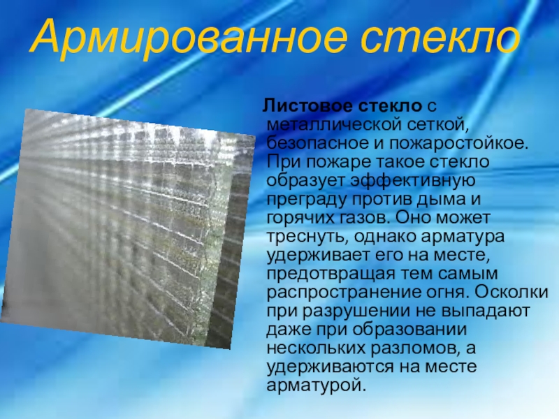 Слайд 11 Листовое стекло с металлической сеткой, безопасное и пожаростойкое. При пожаре такое