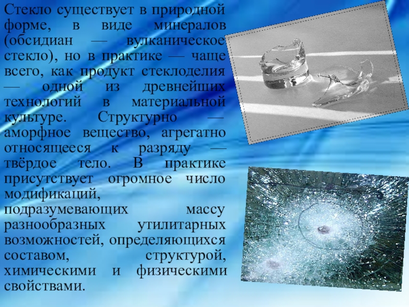Слайд 5Стекло существует в природной форме, в виде минералов (обсидиан — вулканическое