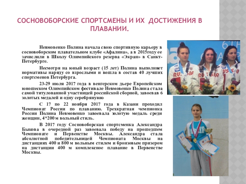 Слайд 8Сосновоборские спортсмены и их достижения в плавании.