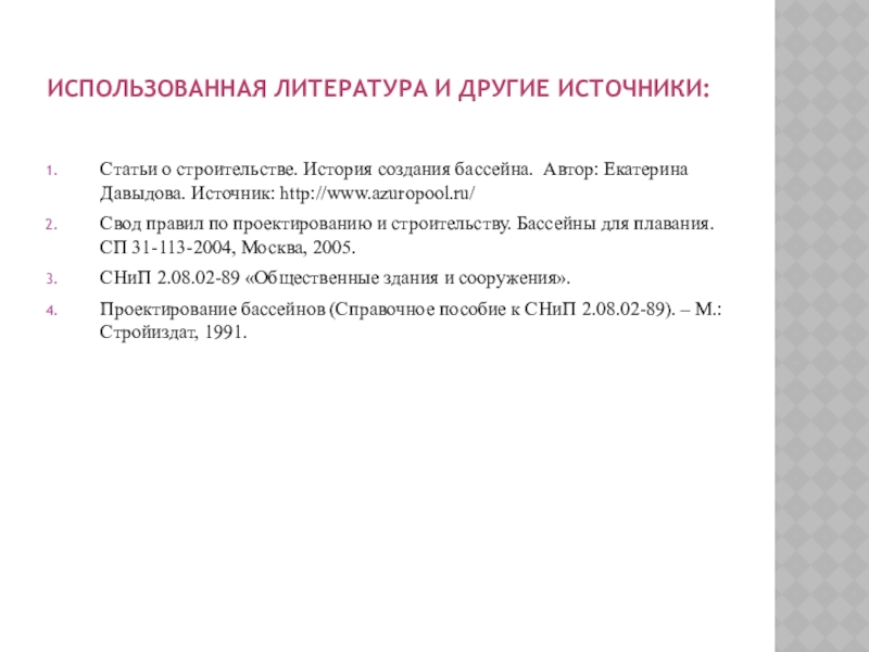 Проектирование бассейнов (Справочное пособие к СНиП 2.08.02-89). – М.: Стройиздат, 1991.