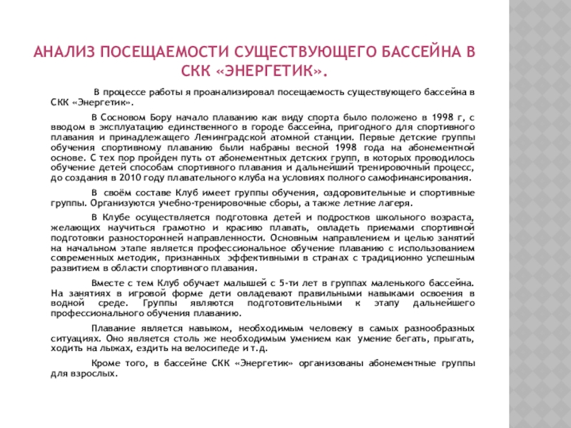 проанализировал посещаемость существующего бассейна в СКК «Энергетик».