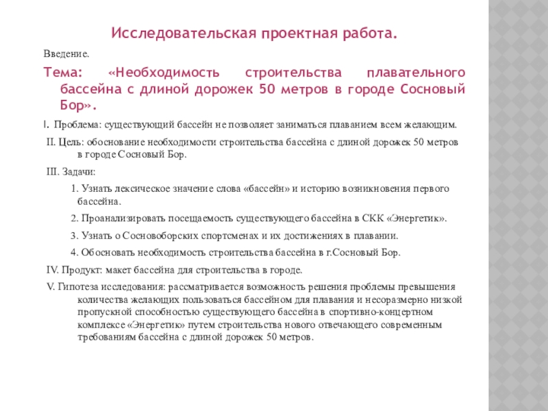II. Цель: обоснование необходимости строительства бассейна с длиной дорожек 50 метров в городе Сосновый Бор.