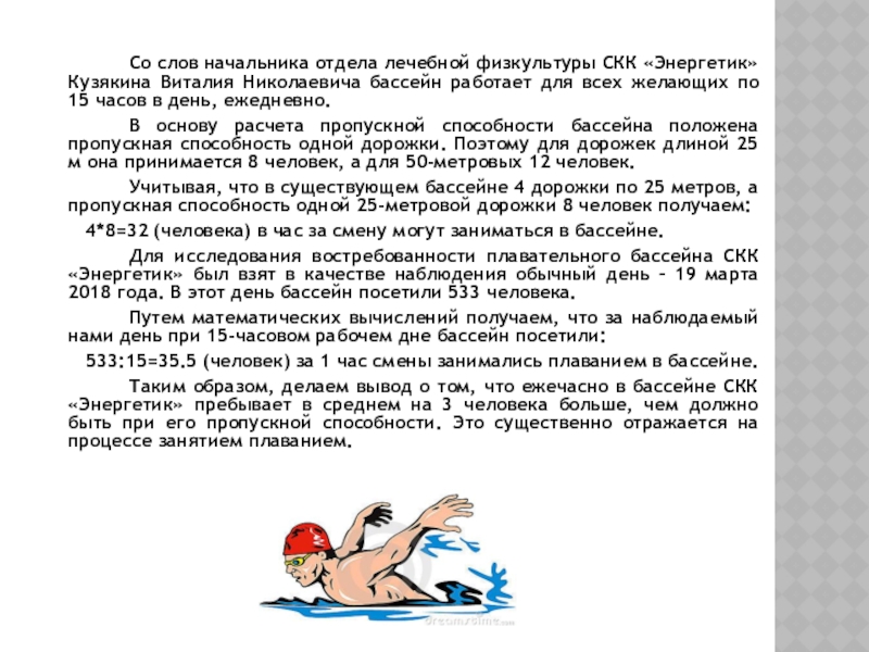 Таким образом, делаем вывод о том, что ежечасно в бассейне СКК «Энергетик» пребывает в среднем на 3 человека больше, чем должно быть при его пропускной способности. Это существенно отражается на процессе занятием плаванием.