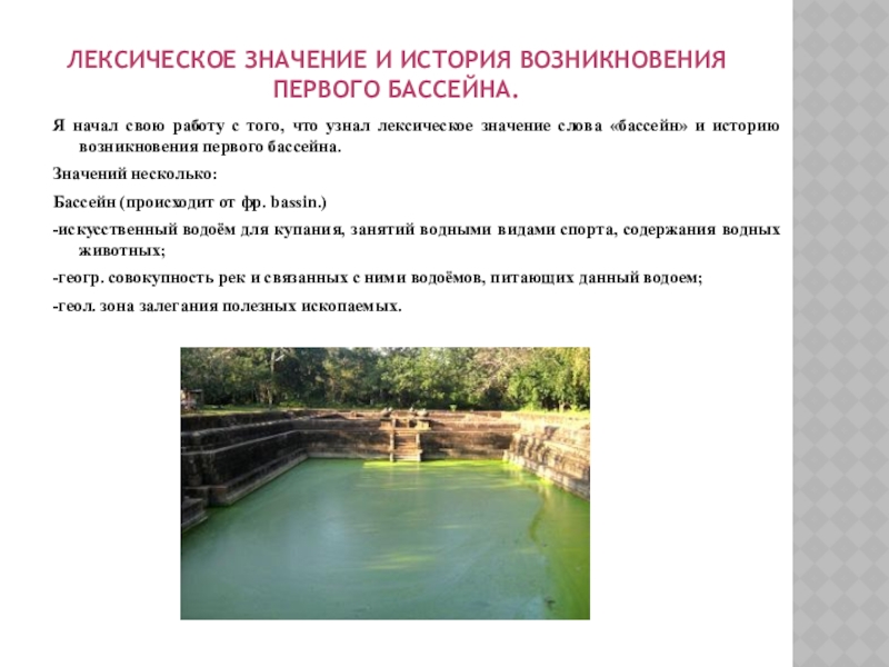 того, что узнал лексическое значение слова «бассейн» и историю возникновения первого бассейна.