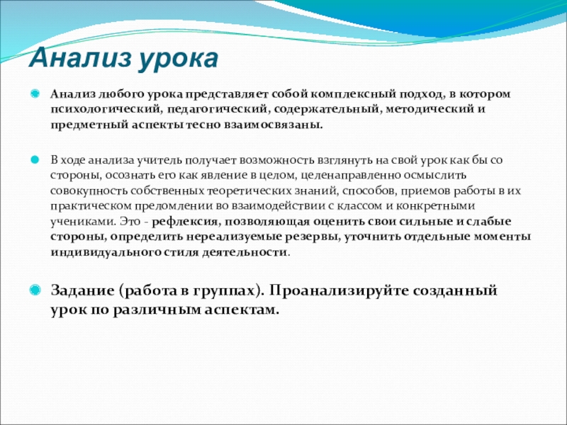 Анализ любого урока представляет собой комплексный подход, в котором психологический,