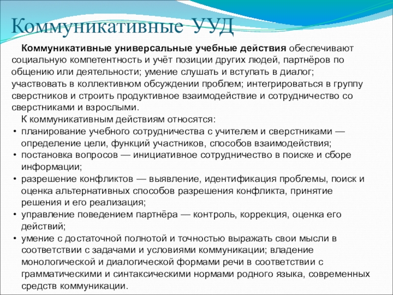 Коммуникативные универсальные учебные действия обеспечивают социальную компетентность и учёт позиции