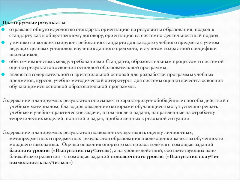 отражают общую идеологию стандарта: ориентацию на результаты образования, подход к