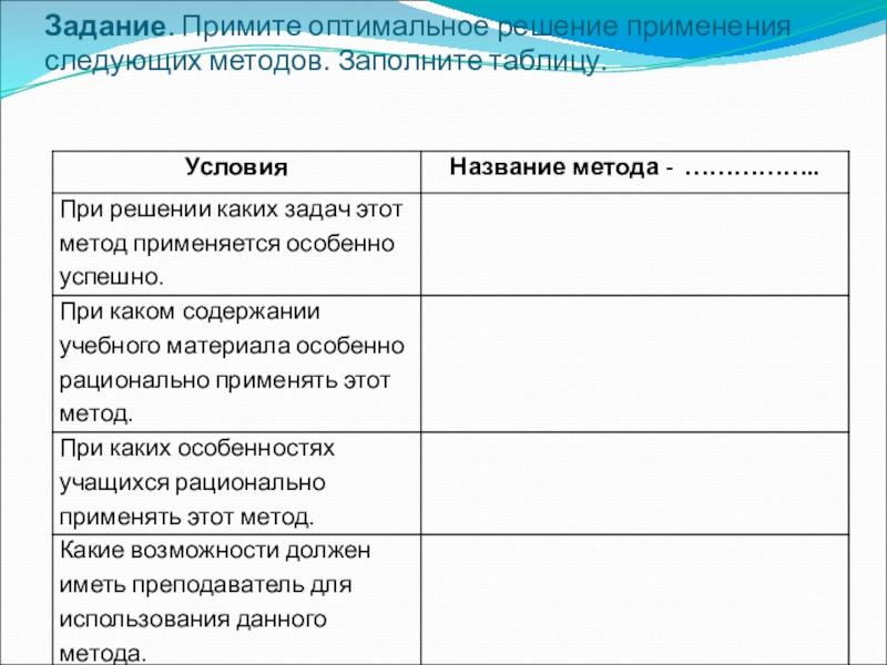 Слайд 52Задание. Примите оптимальное решение применения следующих методов. Заполните таблицу.
