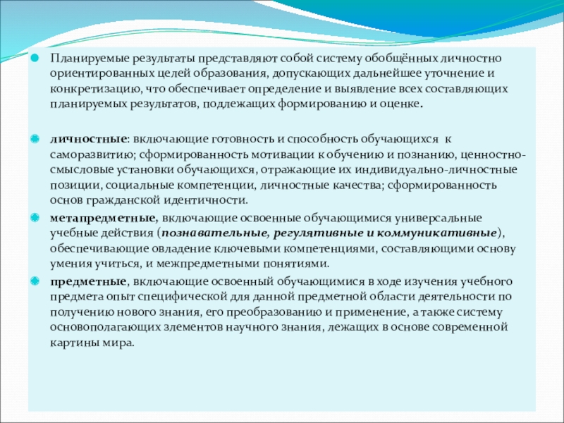 Слайд 4Планируемые результаты представляют собой систему обобщённых личностно ориентированных целей образования, допускающих