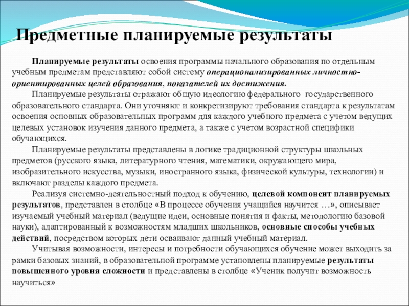 Планируемые результаты отражают общую идеологию федерального государственного образовательного стандарта. Они уточняют и конкретизируют требования стандарта к результатам освоения основных образовательных программ для каждого учебного предмета с учетом ведущих целевых установок изучения данного предмета, а также с учетом возрастной специфики обучающихся.