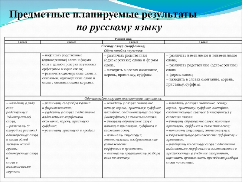Планируемые результаты представлены в логике традиционной структуры школьных предметов (русского языка, литературного чтения, математики, окружающего мира, изобразительного искусства, музыки, иностранного языка, физической культуры, технологии) и включают разделы каждого предмета.
