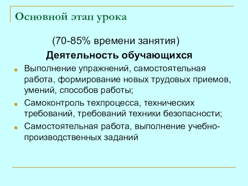Выполнение упражнений, самостоятельная работа, формирование новых трудовых приемов, умений, способов работы;