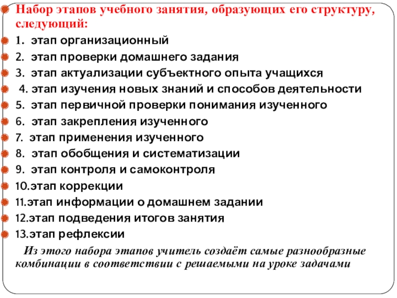 Из этого набора этапов учитель создаёт самые разнообразные комбинации в соответствии с решаемыми на уроке задачами