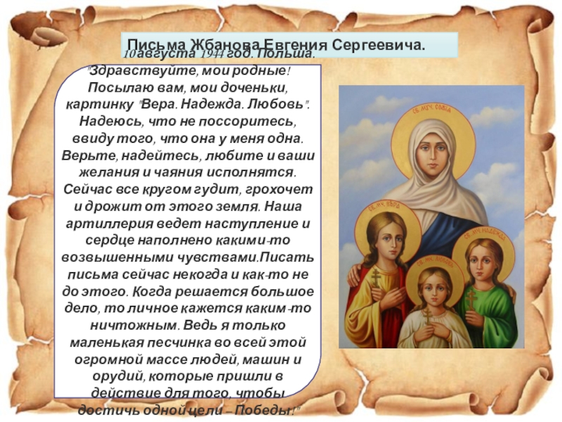 мои доченьки, картинку "Вера. Надежда. Любовь". Надеюсь, что не поссоритесь, ввиду того, что она у меня одна. Верьте, надейтесь, любите и ваши желания и чаяния исполнятся.Сейчас все кругом гудит, грохочет и дрожит от этого земля. Наша артиллерия ведет наступление и сердце наполнено какими-то возвышенными чувствами.Писать письма сейчас некогда и как-то не до этого. Когда решается большое дело, то личное кажется каким-то ничтожным. Ведь я только маленькая песчинка во всей этой огромной массе людей, машин и орудий, которые пришли в действие для того, чтобы достичь одной цели – Победы!"