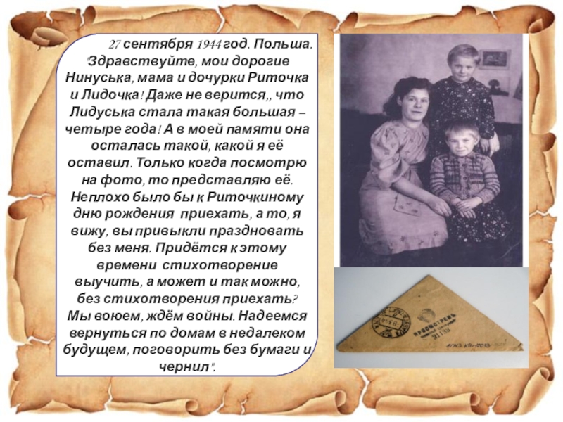 "Здравствуйте, мои дорогие Нинуська, мама и дочурки