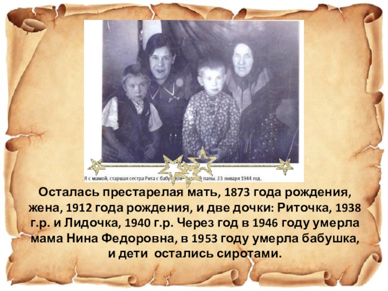 Слайд 6Осталась престарелая мать, 1873 года рождения, жена, 1912 года рождения, и