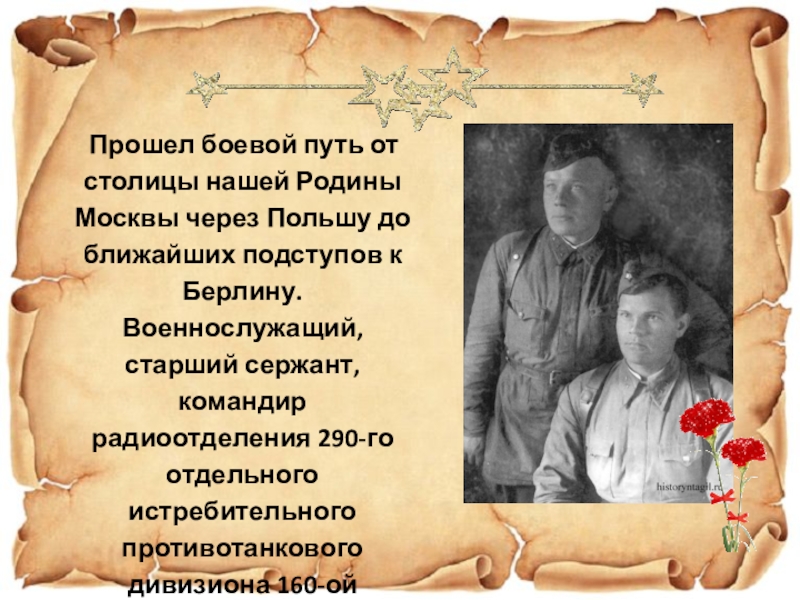 до ближайших подступов к Берлину. Военнослужащий, старший сержант, командир радиоотделения 290-го отдельного истребительного противотанкового дивизиона 160-ой стрелковой дивизии 114 стрелковый корпус.