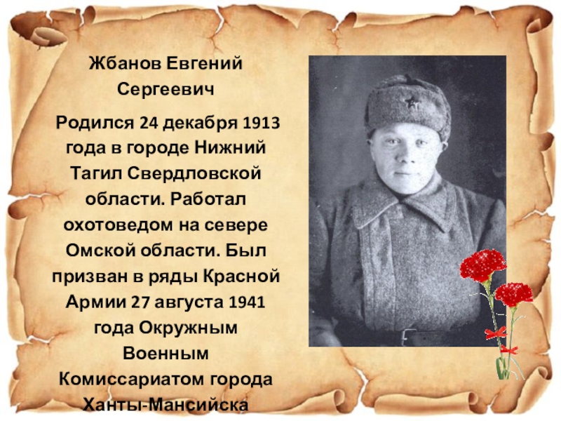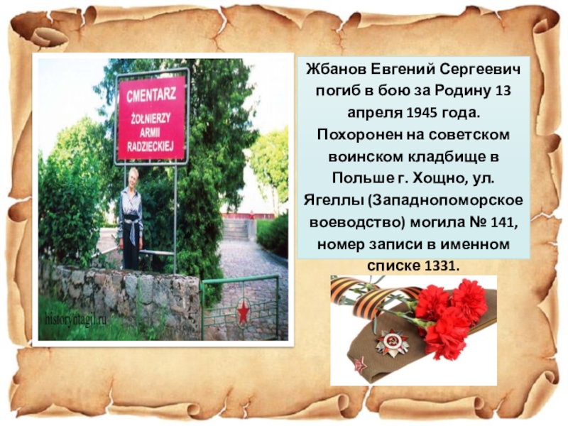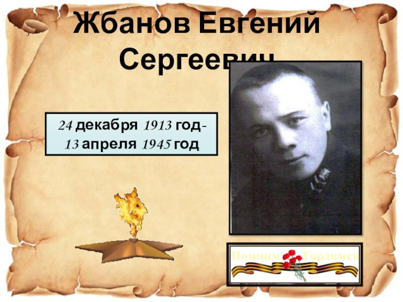 Слайд 11Жбанов Евгений Сергеевич погиб в бою за Родину 13 апреля 1945