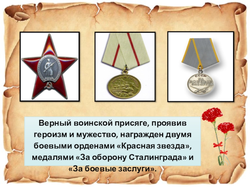 Слайд 12Верный воинской присяге, проявив героизм и мужество, награжден двумя боевыми орденами