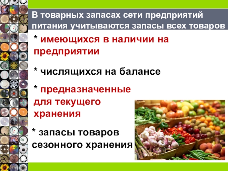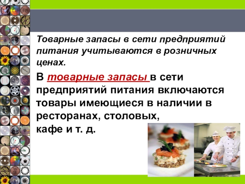 Товарные запасы в сети предприятий питания учитываются в розничных ценах.
