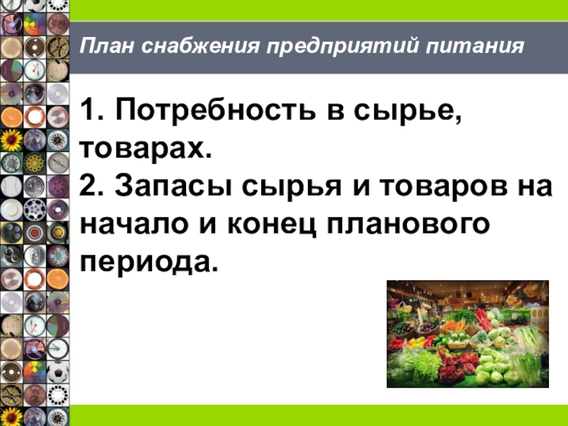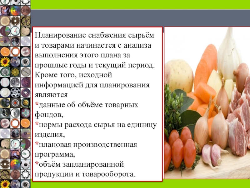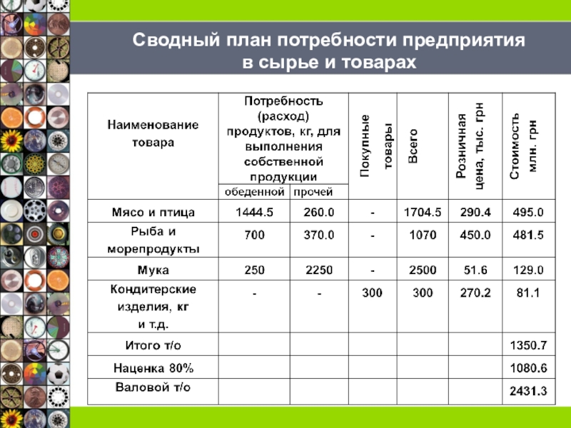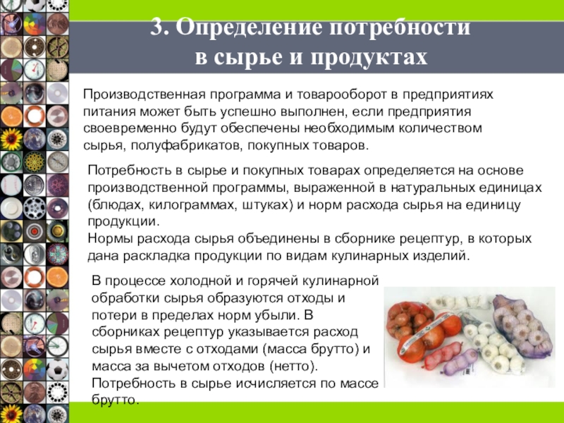 Потребность в сырье и покупных товарах определяется на основе производственной программы, выраженной в натуральных единицах (блюдах, килограммах, штуках) и норм расхода сырья на единицу продукции.