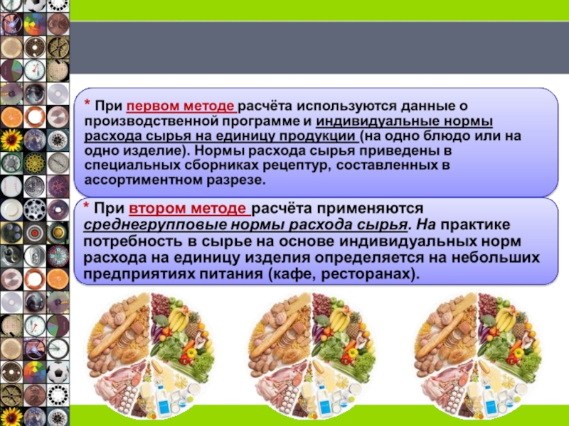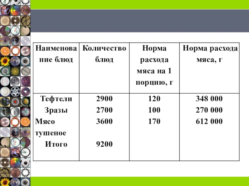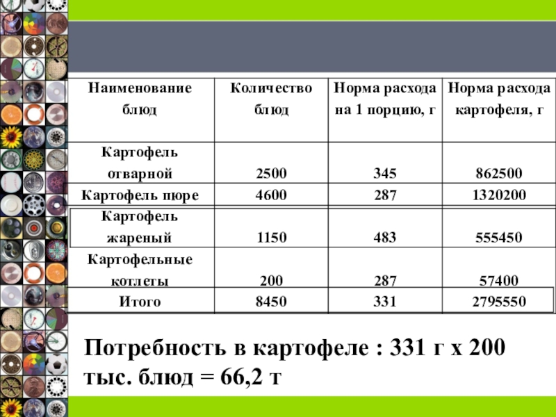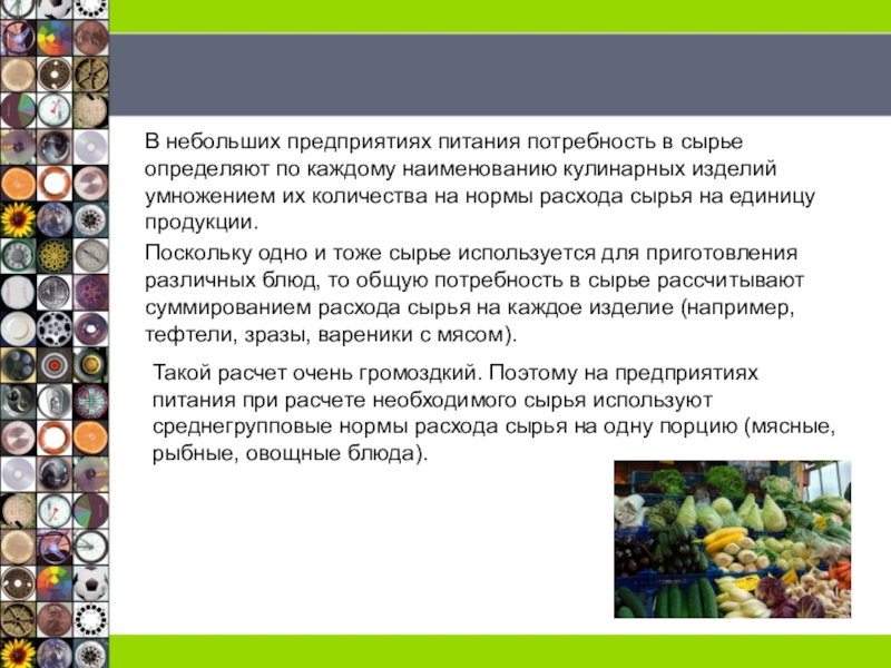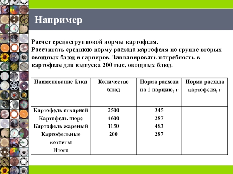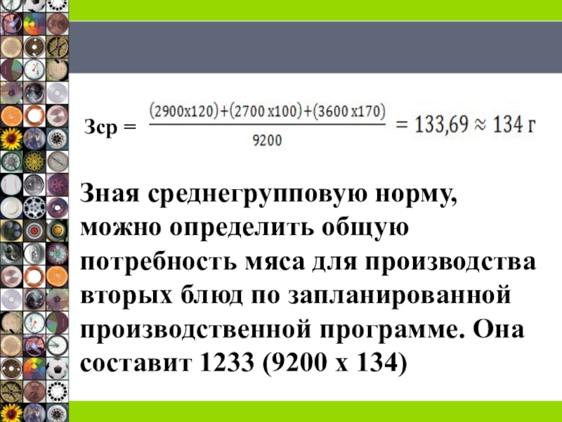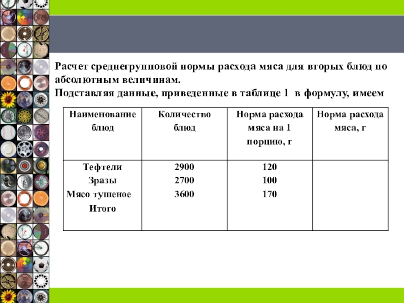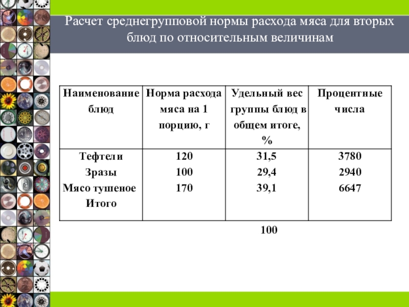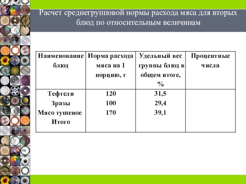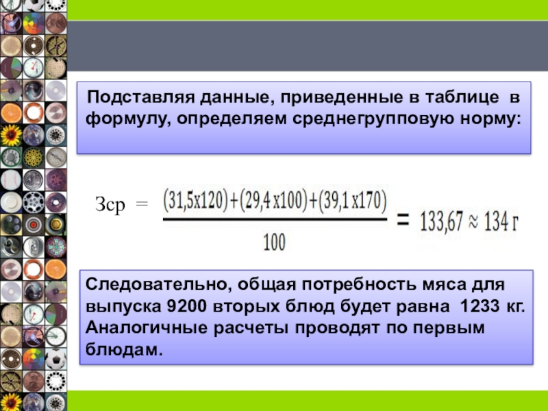 Такой расчет очень громоздкий. Поэтому на предприятиях питания при расчете необходимого сырья используют среднегрупповые нормы расхода сырья на одну порцию (мясные, рыбные, овощные блюда).