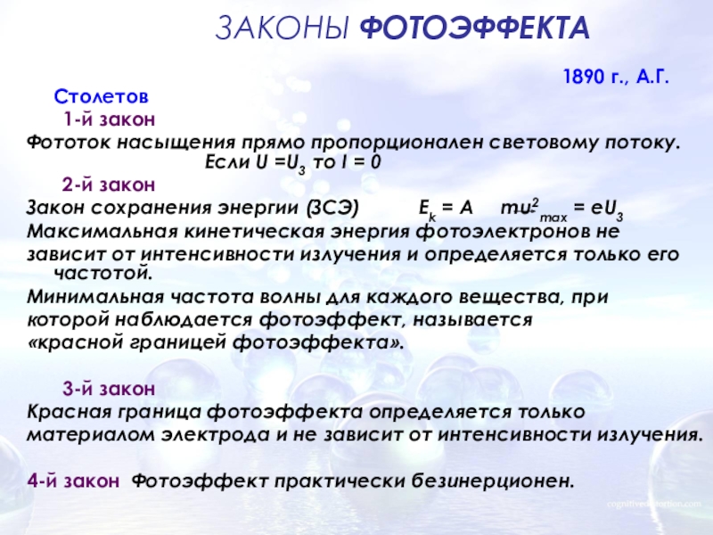 Изменяя условия освещения на этой же установке, А. Г. Столетов открыл второй закон фотоэффекта: кинетическая энергия