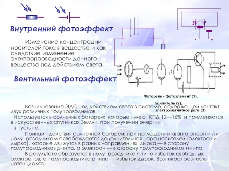 Применение: фоторезисторы - автоматическое управление электрическими цепями с помощью световых сигналов (фотореле); фотоэлементы - солнечные батареи, люксметры фотоэкспонометры.