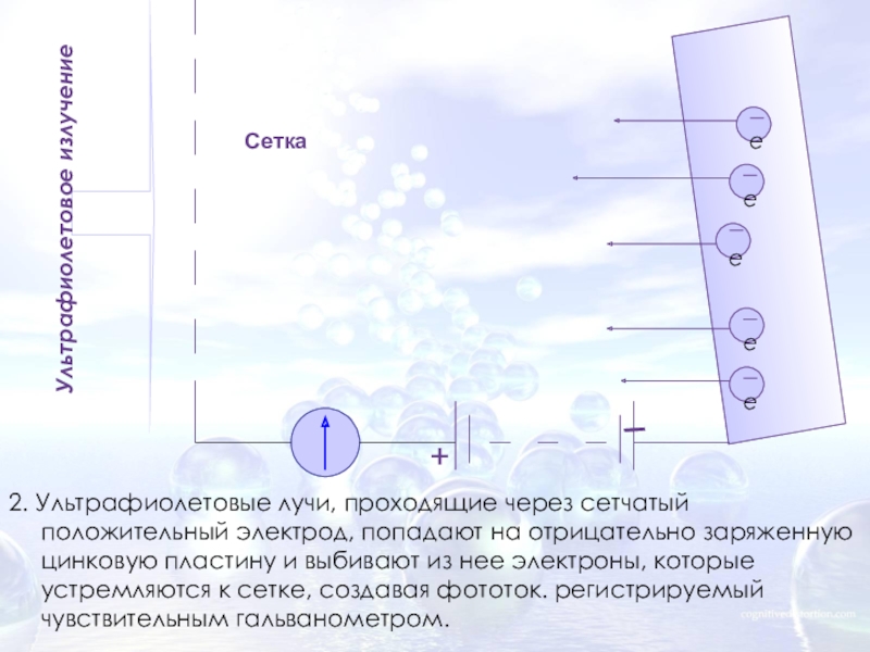 1. Цинковую пластину, соединенную с электроскопом, заряжают отрицательно и облучают ультрафиолетовым светом. Она быстро разряжается. Если же ее зарядить положительно, то заряд пластины не изменится.